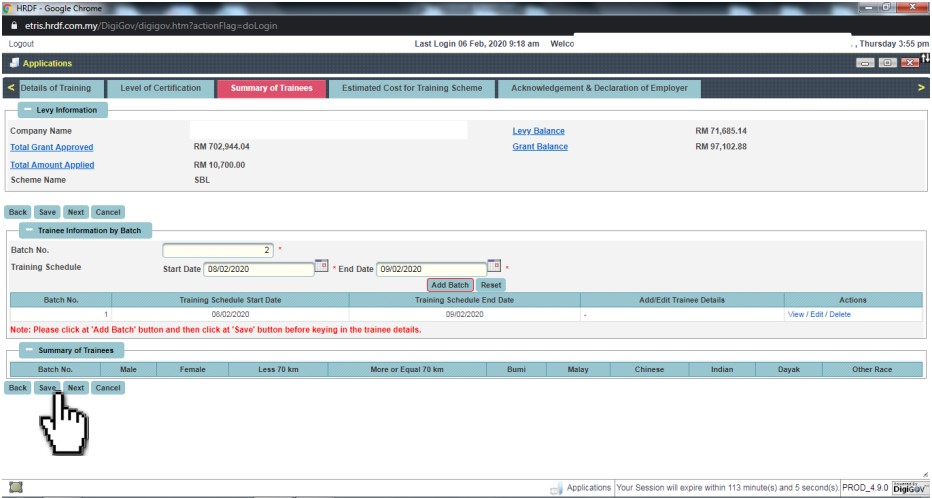 • Enter one (1) at “Batch No.” if only train a group of employees. Then click “Save
