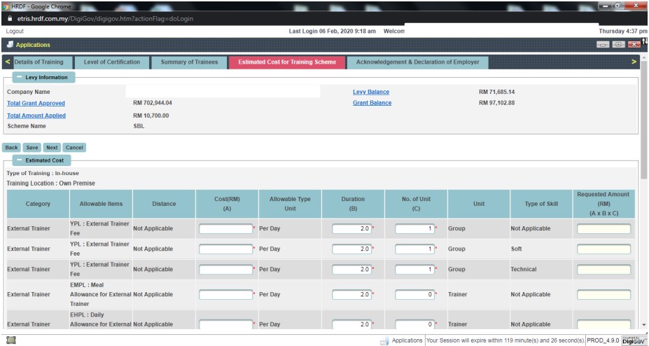• Enter all the required details of the training estimated cost. Then, click “Save