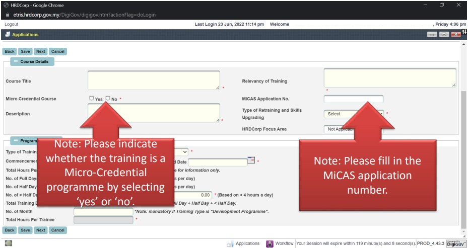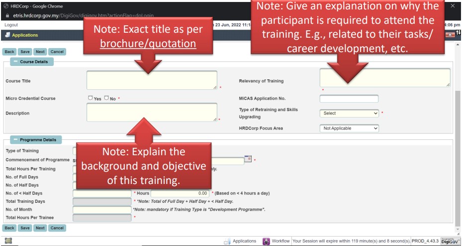 • Enter all the required programme details. Refer to the training content provided by the training provider. Then, click “Next” button