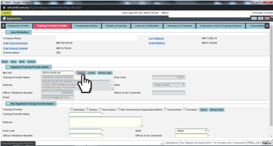 • Search for training provider “Training Provider Name” or “MyCoID“. Then, click the “Next